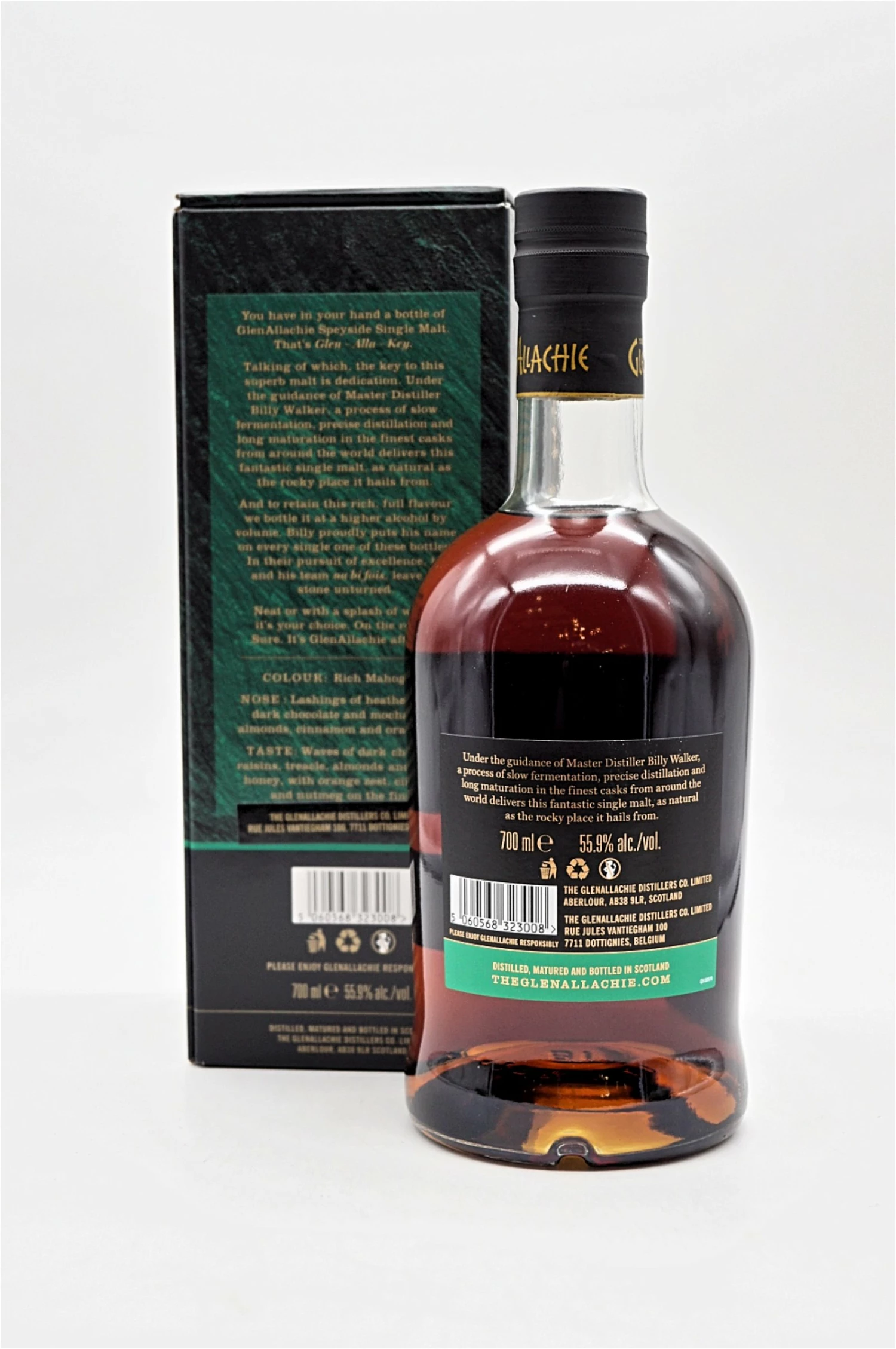 Die Gerste kommt von Crisps Maltings in Portgordon, etwa eine halbe Stunde entfernt. Traditionell ist GlenAllachie Whisky nicht rauchig. Ihr neues Team geht aber auch neue Wege: Seit 2018 produzieren sie erstmals Whisky aus Gerste, die über einem Torffeuer gedarrt wurde. Bis sie den ersten rauchigen GlenAllachie abfüllen können, wird aber noch ein bisschen Zeit vergehen. Die Mühle ist schon genauso alt wie die GlenAllachie Distillery selbst. Kein Wunder, denn es ist eine originale Porteus-Mühle – in Whisky-Kreisen eine echte Legende. Es heißt: Die Porteus-Maschinen sind so gut, dass sie nie gewartet werden müssen, geschweige denn kaputtgehen. Gut für alle, die eine besitzen, schlecht für den Hersteller – den gibt es schon lange nicht mehr. Das gemahlene Gerstenmalz – das Schrot – vermischen sie in den Maischbottichen mit heißem Wasser, um ihm so den Zucker zu entziehen. Die meisten anderen Destillerien machen das Ganze dreimal. Wir hängen noch ein viertes Mal ran, um auch wirklich keinen Zucker zu verschenken. Wie gesagt, ein durchweg schottisches Team! Das Endergebnis ist eine Zuckerlösung – genannt Würze –, die anschließend abgekühlt wird.Die Würze – das Ergebnis des Maischens – landet anschließend in einem der acht Gärbottiche aus Edelstahl. Für die alkoholische Gärung geben sie dort flüssige Destillierhefe hinzu. Für besonders leichte, komplexe und fruchtige Aromen setzen wir bei GlenAllachie auf eine ungewöhnlich lange Gärzeit: 120 Stunden – in Schottland inzwischen eine absolute Seltenheit. Die Maische wird in einer der vier Brennblasen zum Sieden gebracht. Der Dampf steigt durch den Schwanenhals in den Kondensator auf, wo er abgekühlt und wieder flüssig wird. Das Besondere bei GlenAllachie: Der Kondensator wurde ursprünglich horizontal eingebaut. Warum? Da sind sie sich auch nicht ganz sicher. Aber: Sie können die Destillation dadurch auf jeden Fall noch präziser steuern. Eine weitere Besonderheit sind die zwei separaten Spirit Safes. In ihnen trennt das Distillery Team den Vor- und Nachlauf vom Rest des Destillates. Mit zwei Safes können sie also zwei unterschiedliche New Makes parallel produzieren. Sie befüllen wöchentlich etwa 100 Eichenholzfässer mit den frischen Destillaten – darunter Ex-Bourbon, Ex-Sherry- und diverse andere amerikanische und europäische Fässer. Für unterschiedliche Geschmacksprofile füllen sie die New Makes mit verschiedenen Alkoholgehalten in die Fässer: 63,5 %, 68 % und 72 % vol. Sie lagern anschließend in einem der 16 Warehouses. Und das mindestens 10 Jahre für die GlenAllachie Core Range – denn vor dem Alter hegen sie großen Respekt.
