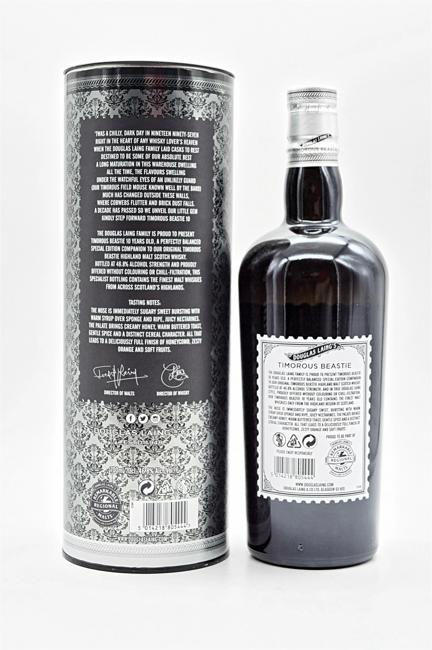 Timorous Beastie 10 Years Old ist ein wunderschön gealterter Highland „Vatted“ Malt, der stolz ohne Färbung oder Chill-Filtration angeboten wird. Timorous Beastie 10 Years Old wird mit einem Alkoholgehalt von 46,8% abgefüllt und enthält gewürzte herbstliche Früchte, ergänzt durch Honig, Müsli und Orange.