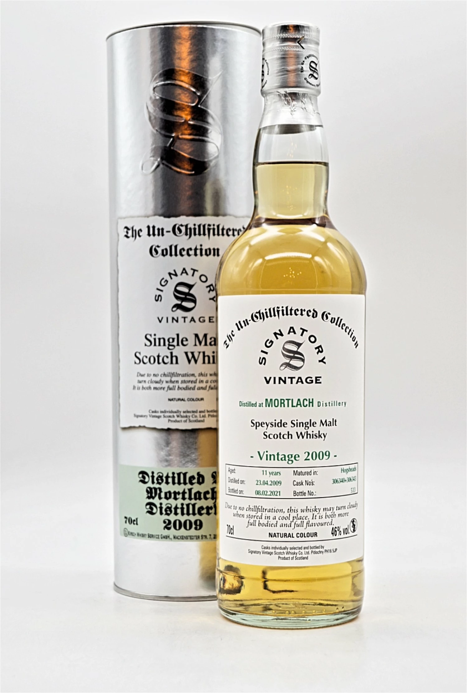 Die Un-Chillfiltered Collection ist eine Serie von Single Malt Scotch Whiskys des unabhängigen Abfüllers Signatory Vintage. In Deutschland zählt Signatory zu den beliebtesten unabhängigen Abfüllern. Wie der Name der Serie bereits verrät, werden hier nur Whiskys abgefüllt, bei denen auf die Kühlfiltration verzichtet wurde. Bei Interesse können Sie hier mehr über die Kühlfilterung bei Whisky erfahren. Mit regulär 46% Alkoholvolumen sind die Whiskys der Un-Chillfiltered Collection in perfekter Trinkstärke abgefüllt. Die erhöhte Trinkstärke verhindert auch ein Eintrüben des Whiskys bei niedrigen Temperaturen. Bei der Zugabe von Wasser oder Eis, kann dies jedoch passieren, hat jedoch keinen Einfluss auf die Aromen des Whiskys. Über die Single Malts dieser Serie von Signatory erhält der geneigte Whiskygenießer viele Informationen. Signatory nennt das Destillations- und das Abfülldatum auf den Tag genau. Auch Fassnummern und Fasstyp werden in der Regel genau kommuniziert. Die Flaschen sind einzeln nummeriert, wobei die Gesamtanzahl der Flaschen nicht mehr auf der Flasche steht. Die unterschiedlichen Whiskyregionen werden über die Farbgebung auf der Tube signalisiert: Islay = Blau, Inseln = Grau, Speyside = Grün, Highlands = Rot, Lowlands = Lila.