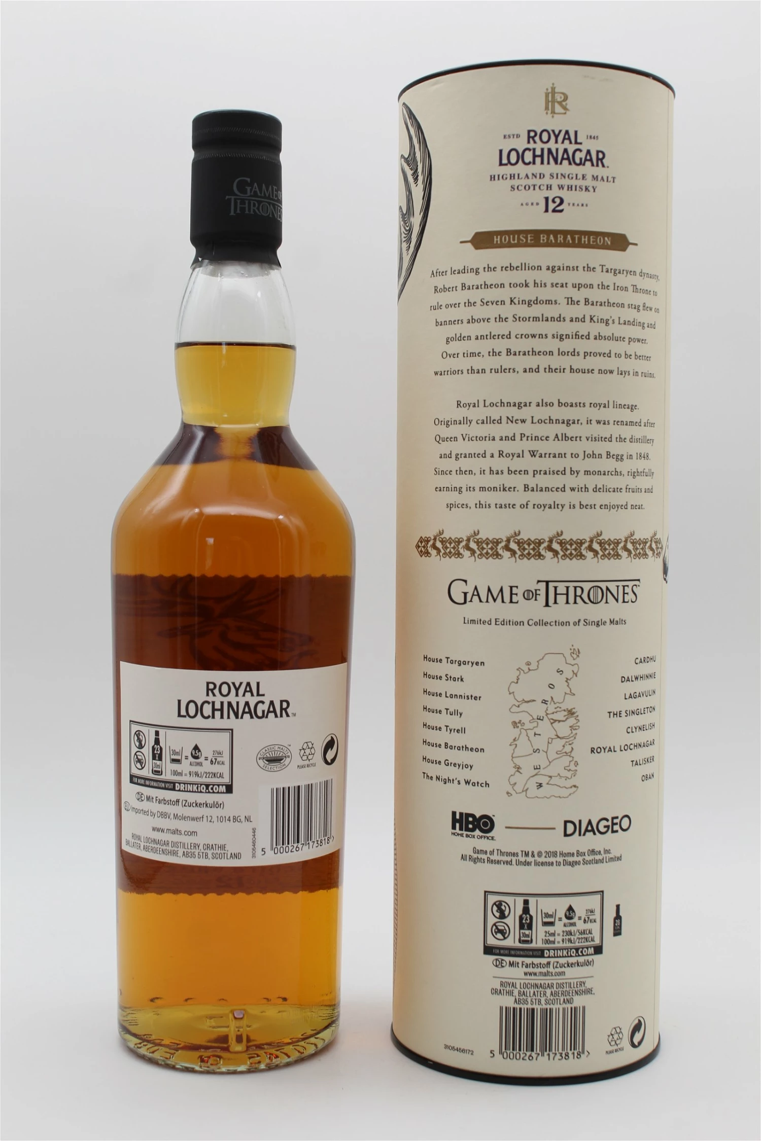 Die Game of Thrones Single Malt Kollektion ist eine Hommage des Diageo-Konzerns an die gefeierte Fantasy-Serie. Die limitierte Reihe umfasst insgesamt acht Whiskys von berühmten schottischen Destillerien, wobei jeder Whisky eines der sieben Königreiche von Westeros und die Nachtwache repräsentieren. Auf dem Flaschenetikett der jeweiligen Sorte ist das Wappen der Familie zu finden, die Flasche der Nachtwache ist in Schwarz gehalten. In der GoT-Reihe stehen die Sorten Singleton of Glendullan Select – House Tully, Dalwhinnie Winter’s Frost – House Stark, Cardhu Gold Reserve – House Targaryen, Lagavulin 9 Jahre – House Lannister, Talisker Distillery Select Reserve – House Greyjoy, Royal Lochnagar 12 Jahre – House Baratheon, Clynelish Reserve – House Tyrell und Oban Bay Reserve – The Night’s Watch zur Verfügung.