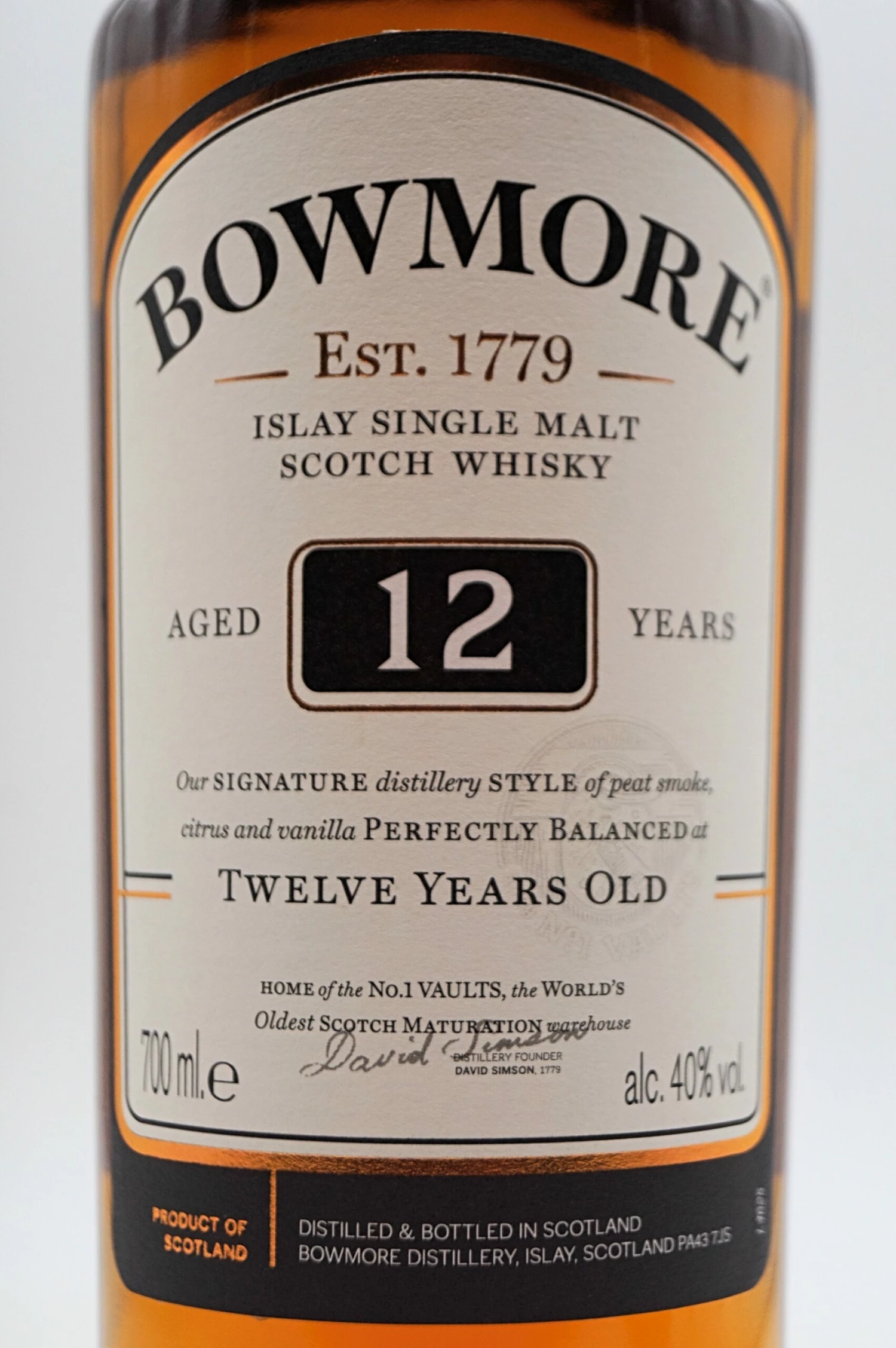 Seit 1779 wird inmitten der herben Schönheit von Islay, den rauen Seen und den Hebridenwinden Single Malt Scotch Whisky in Bowmore hergestellt. Die Brennmeister, die für ihre Arbeit die erlesensten und hochwertigsten Eichenfässer verwenden und die Tradition an die nächste Generation weitergeben, stellt Bowmore, Single Malt Scotch Whisky aus lediglich drei Zutaten her: Gerste, Hefe und Wasser. Dieser Prozess wurde in nahezu über 240 Jahren perfektioniert. Das weiche Frischwasser aus dem nahegelegenen Fluss Laggan, die Gerste, sorgfältig gezüchtete Hefe und der herausragende Charakter von Islay tragen alle zur Kreation des Bowmore Single Malt Scotch Whisky bei und sind ein unvergleichliches Erbe. In den legendären No. 1 Vaults, dem alten steinernen Reifungslager am Rande des Loch Indaal, vereint sich der zauberhafte Charakter Islays mit jahrhundertealter Tradition im Zeichen der gemächlichen Reifung und führt zur Herstellung eines Whiskys, der durch seine Ausgewogenheit, Komplexität und Schönheit besticht.