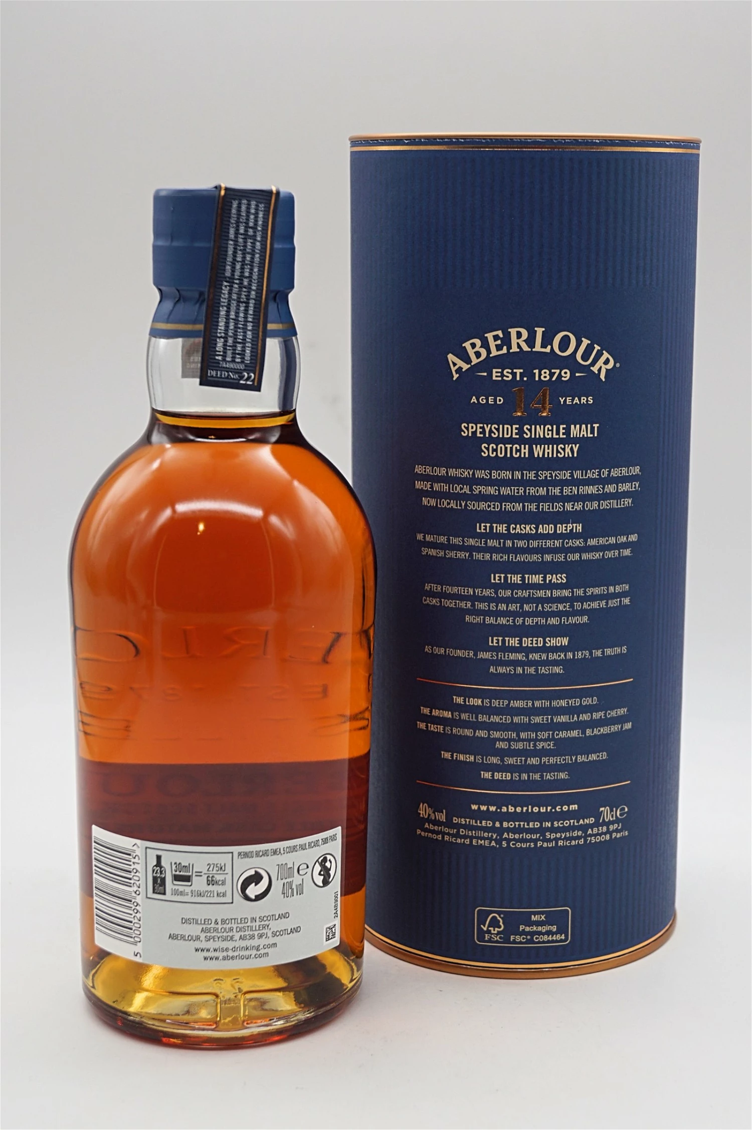 Wir stellen Aberlour 14 vor, eine neue Einzelchargen-Veröffentlichung, die das sorgfältige Handwerk der Hersteller mit einem tiefen Verständnis und Respekt für den natürlichen Reifungsprozess verbindet. Dieser Ansatz behält den inhärenten Charakter der feinsten Zutaten; Verleiht weiche und sanfte Noten von schwarzer Johannisbeere und einen reichhaltigen cremigen Abgang.