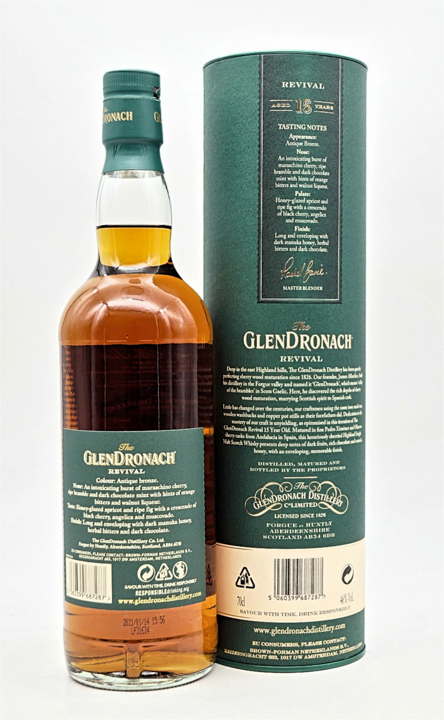 Diese neue Abfüllung von Glendronach trägt den Zusatz Revival. Sie ist der Nachfolger des sehr beliebten 15-jährigen Glendronach der seit langem vergriffen war.