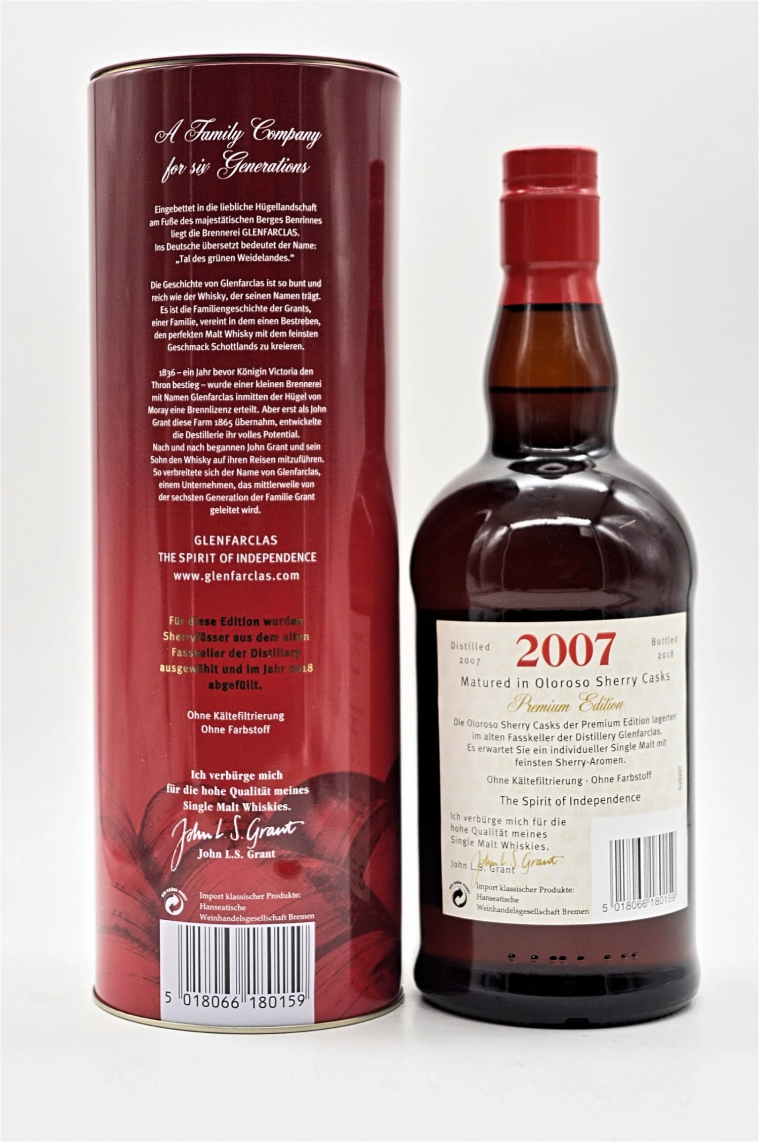 Für diesen Glenfarclas 2007/2018 Premium Edition wurden beste Oloroso Sherryfässer ausgesucht und nach gut 11 Jahren Reifezeit zu diesem fruchtig-herben Single Malt vermählt. Der Whisky wurde nicht gefärbt, daher kommt auch der satte Rotstich aus just diesen ehemaligen Sherryfässern. Auf Kältefiltration wurde verzichtet, sodass alle aromengebenden Öle und Ester noch vorhanden sind. Ein naturbelassener Single Malt Scotch Whisky, der mit kräftigen 46% Alkoholvolumen abgefüllt wurde, sodass die Sherryaromen auch besonders intensiv zum Vorschein kommen können. Da es sich um eine Vintageabfüllung handelt, ist die Anzahl der Flaschen limitiert.