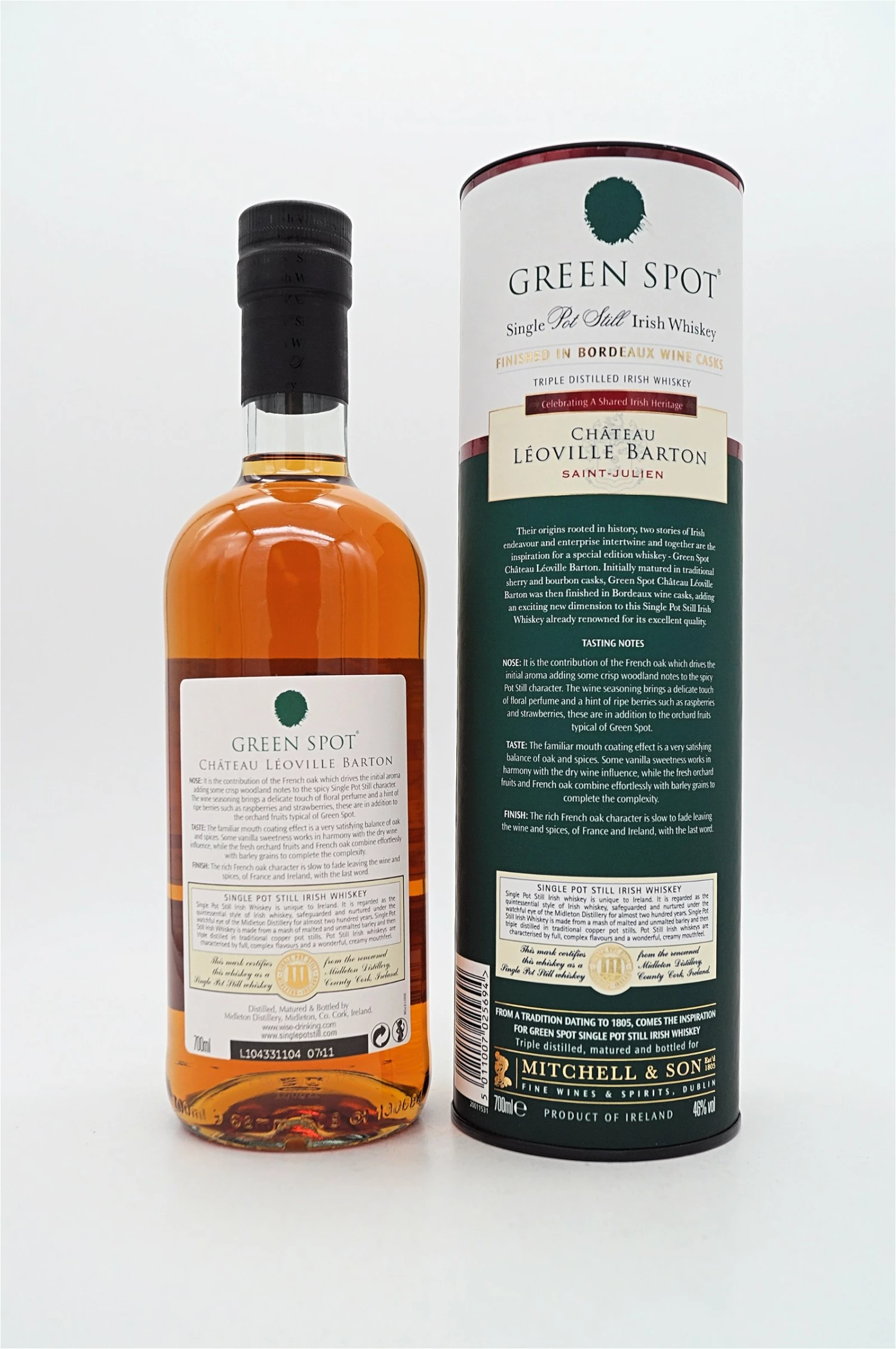 In der Nase macht sich ein angenehmer Duft von reifen roten Äpfeln und dezent rauchigem Holz breit. Am Gaumen überwiegen Noten von getrockneten Beeren und vielseitigen Gewürzen, die sich mit deutlichen Barriquetönen harmonisch vermählen. Dem extravaganten und äußerst beliebten Green Spot Château Léoville Barton ist seine Herkunft anzumerken: Nach der Reifezeit in Ex-Oloroso-Sherry-Fässern und in Ex-Bourbon-Barrels lagert er bis zu 24 Monate in ehemaligen Bordeaux-Weinfässern. Durch dieses Verfahren unterscheidet sich Green Spot Château Léoville Barton nicht nur von anderen Whiskeys, sondern hat auch einen profunden Rotweincharakter, der für einen unverwechselbaren, außergewöhnlichen Genuss und ein herrlich nachklingendes Finish sorgt.
