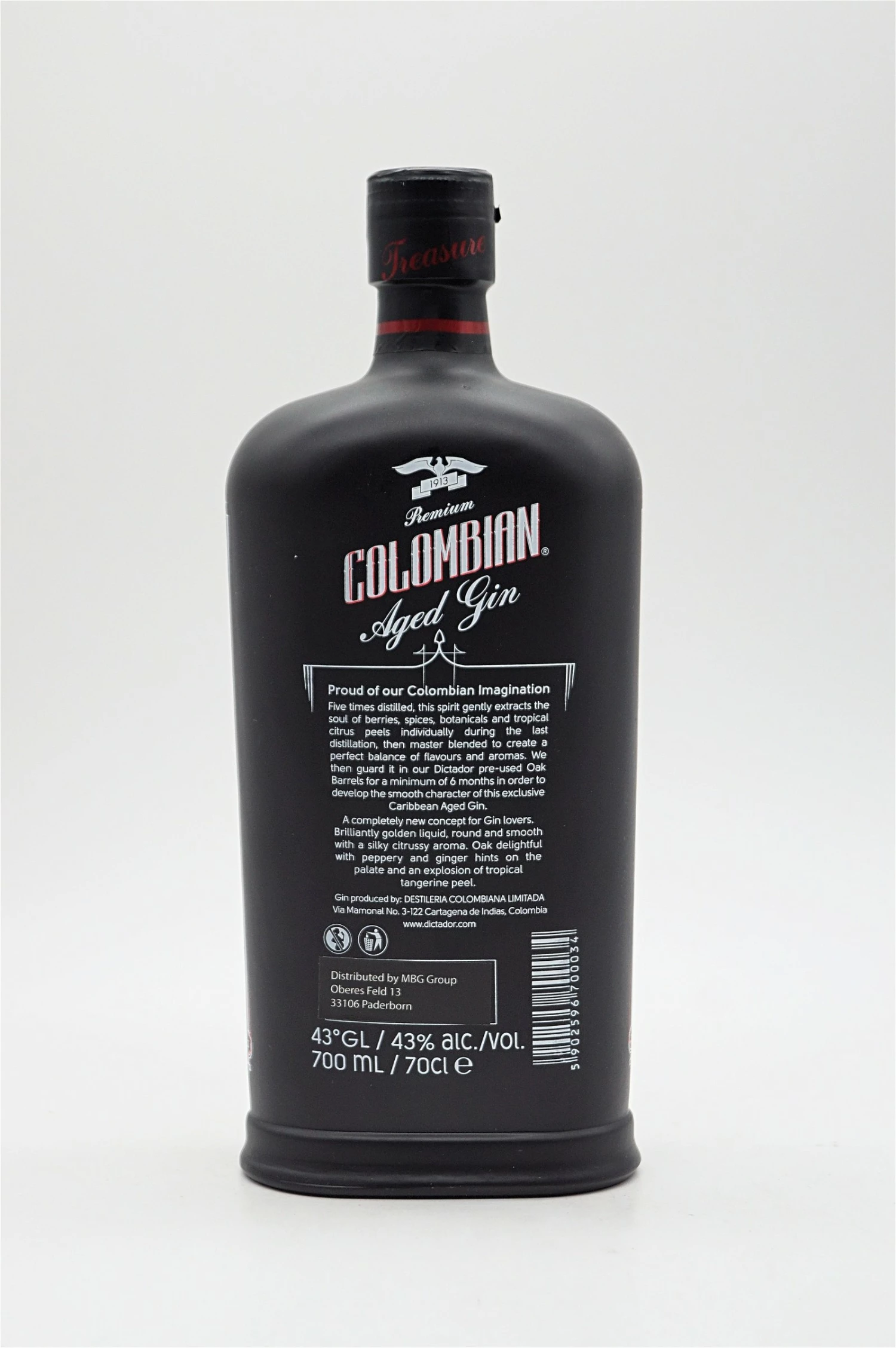 Der Dictator Gin war der erste Gin weltweit auf Zuckerrohr basis. Durch die Lagerung im Dictador Rumfass, zeichnet sich ein noch stärkerer Charakter ab. Der Colombian Gin basiert auf der Formel von Dario Parra, dem ehemaligen Präsidenten des Unternehmen. Die Formel von Beeren, Botanicals, Schalen, Tangerine-Lemon und Gewürzen verleihen Colombian Gin ein einzigartiges Geschmacksprofil.