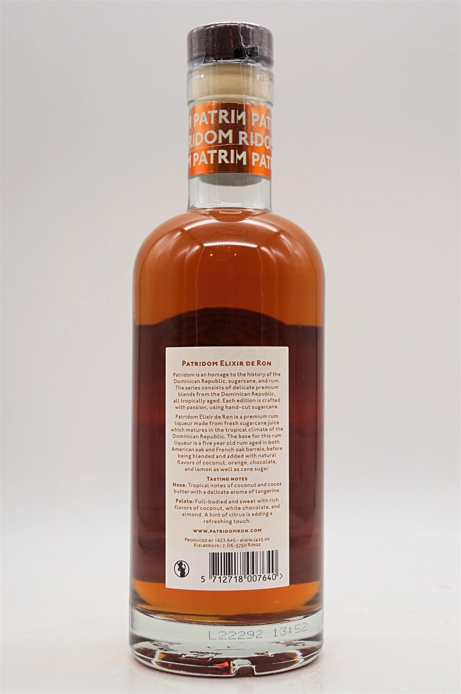 Patridom Elixir de Ron ist ein Premium-Rumlikör aus frischem Zuckerrohrsaft, der im tropischen Klima der Dominikanischen Republik reift. Die Basis für diesen Rumlikör ist ein fünf Jahre alter Rum, der sowohl in Fässern aus amerikanischer als auch aus französischer Eiche gereift ist, bevor er mit natürlichen Aromen von Kokosnuss, Orange, Schokolade und Zitrone sowie Rohrzucker versetzt wird.