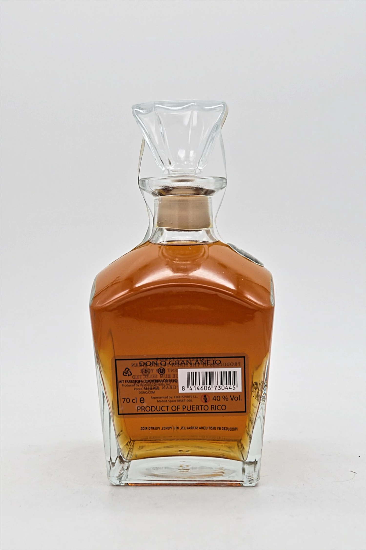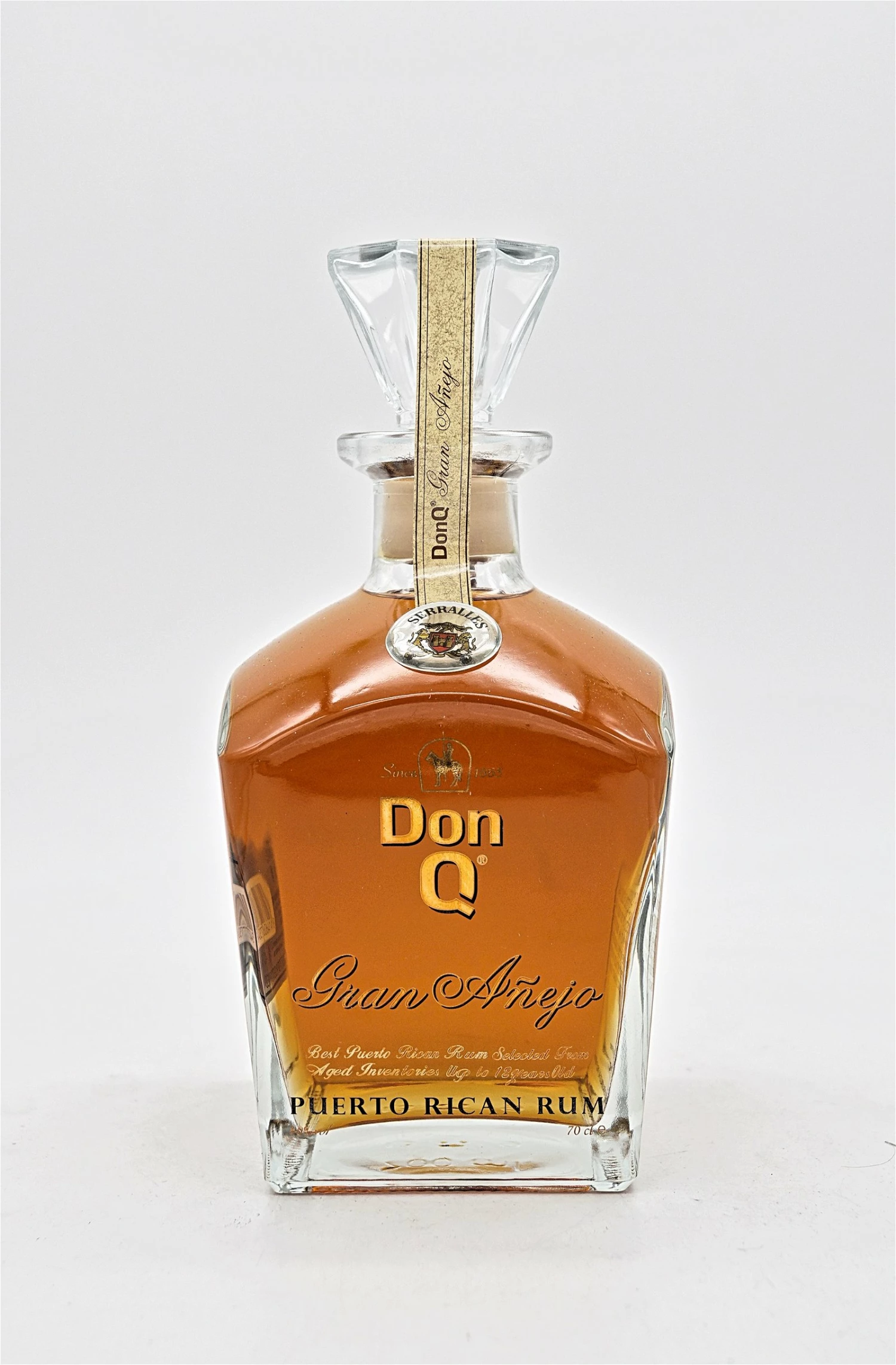 Der Don Q Gran Anejo ist ein sehr hochwertiger Rum aus dem Hause Serralles! Der Inhalt der sehr kunstvoll gestalteten Dekanter Flasche besteht zu 98% aus einem Blend, der zwischen 9 und 12 Jahren gereift wird und zusätzlich zu 2% aus Rum, der bis zu 50 Jahre im Solera Verfahren gelagert ist. Dadurch ist ein sehr ausgewogener und milder Rum entstanden, der durch eine ausgezeichnete Aromen Struktur überzeugt.