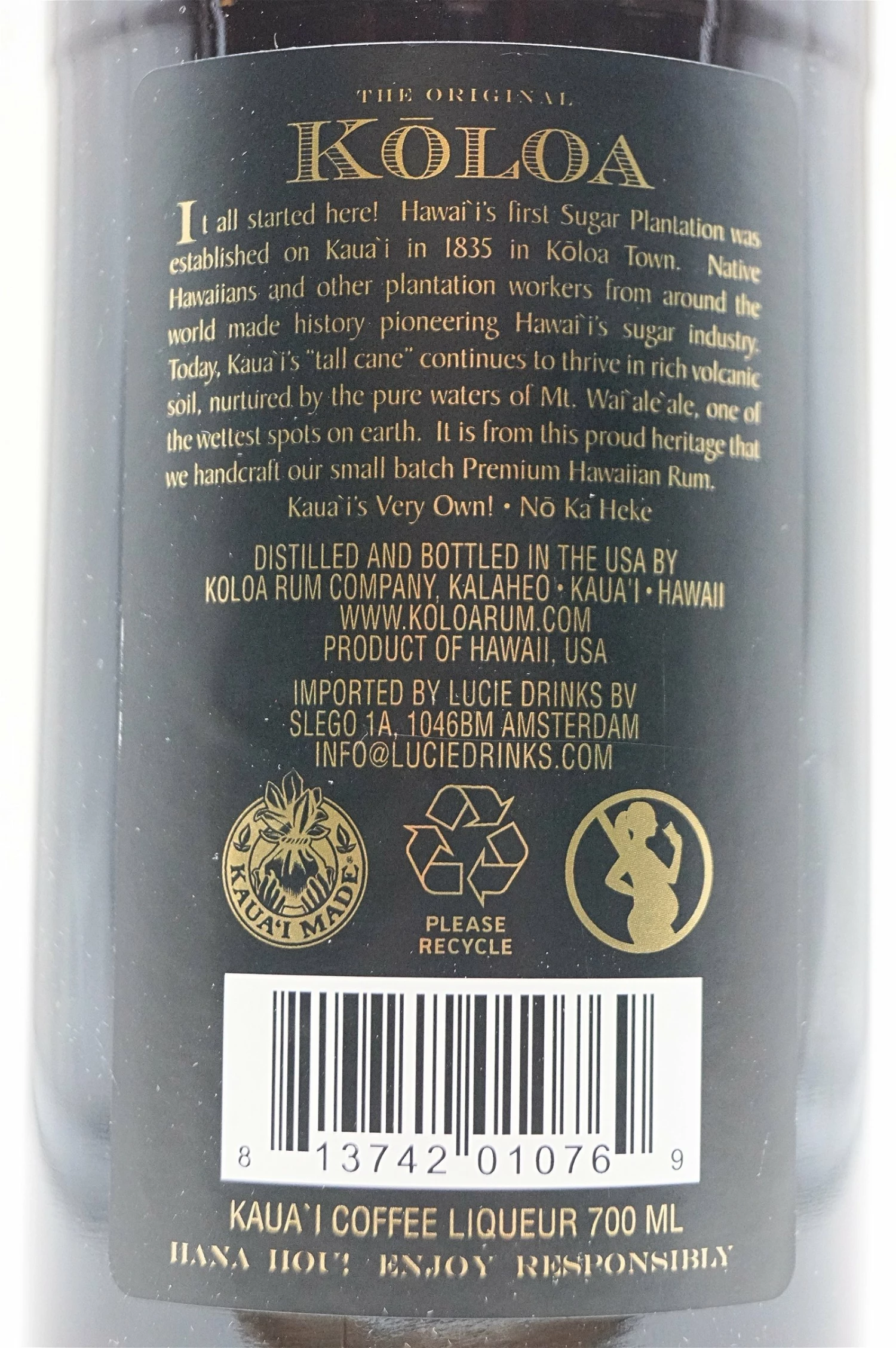 Der Koloa Kauai Coffee stammt von der hawaiianischen Insel Kaua’i und wird von der Kōloa Rum Company destilliert, gemischt und abgefüllt. Der Cooffee Rum-Likör besteht aus hawaiianischem Rum, der mit natürlichen Zutaten verfeinert wurde. Hergestellt wird der Koloa Kauai Coffee aus reinem Rohrzucker, in kleinen dampfbetriebenen Kupferbrennblasen zweifach destilliert und anschließend mit Kaffee aromatisiert.