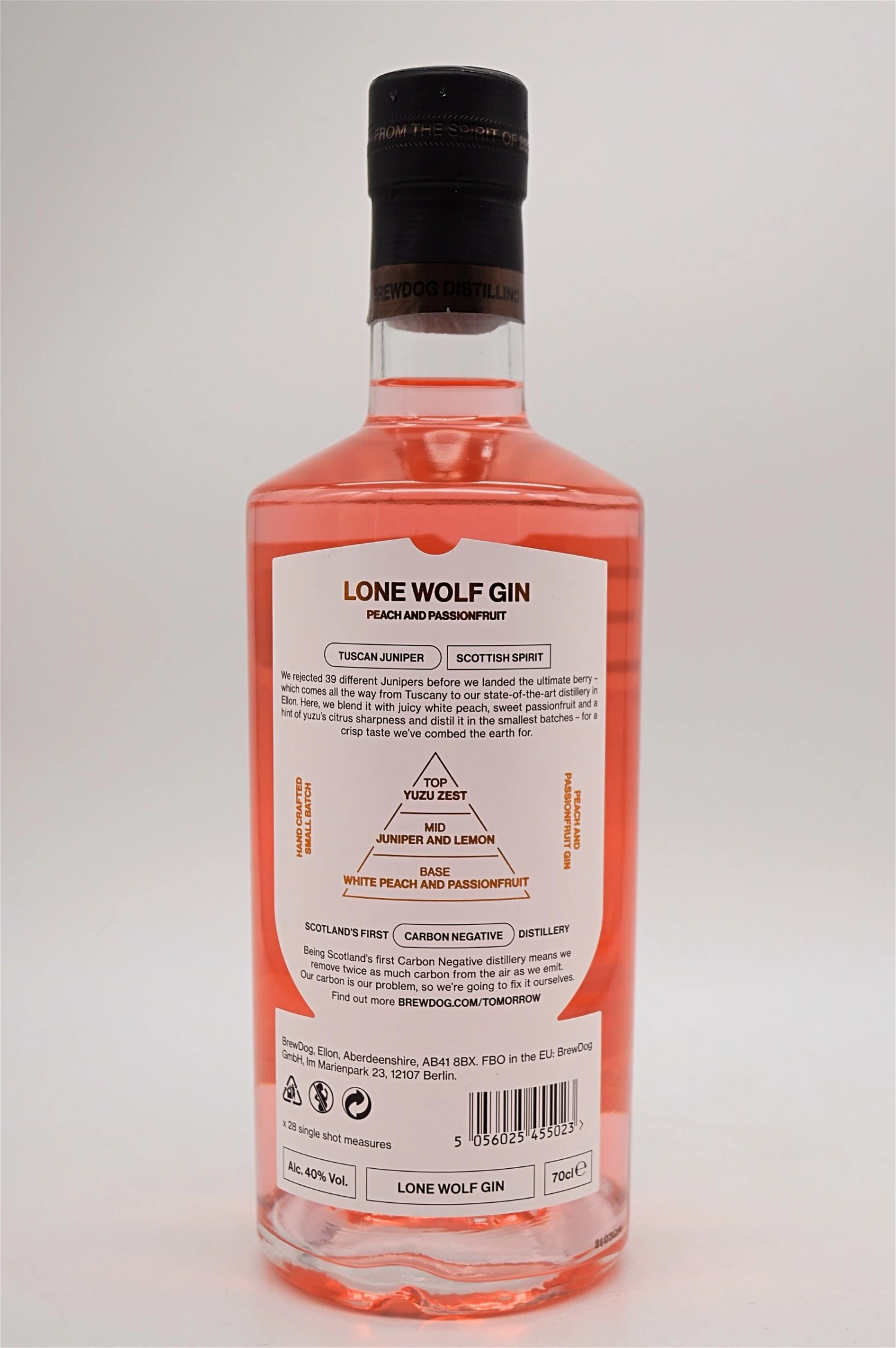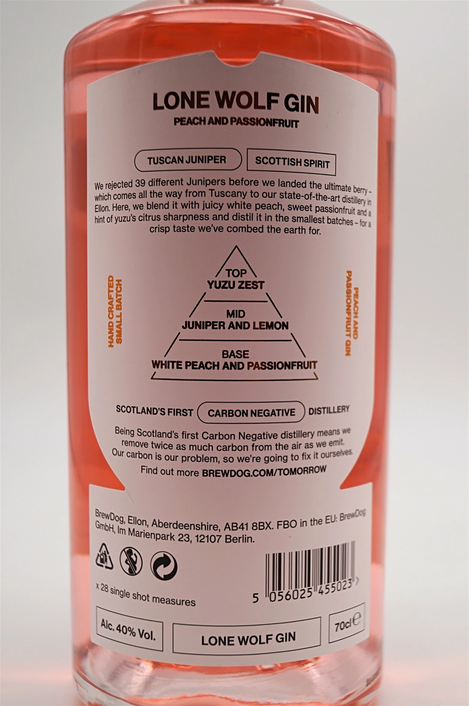In diesen besonderen Gin von Brewdog befinden sich folgende Botinincals: Waldkiefer, toskanischer Wacholder, Grapefruit- und Zitronenschale, rosa Pfeffer, Iris- und Angelikawurzel, Muskatblüte, Yusu, Zitronengras, Kaffernlimette, Mandeln, Koriander, Lavendel, Kardamom, Passionsfrucht und weißer Pfirsich.