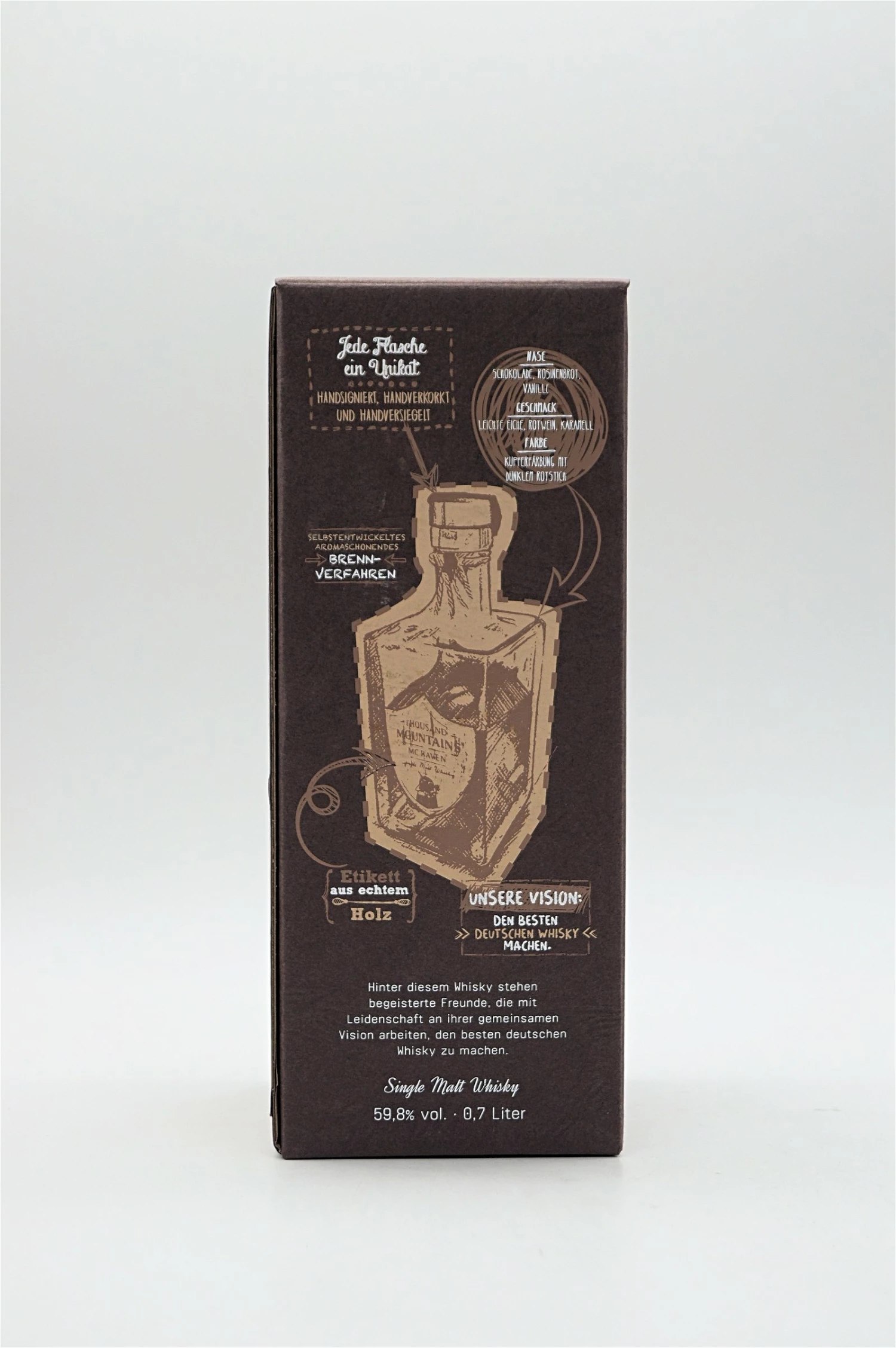 Die Lagerung des Mc Raven erfolgt zunächst in Rotweinfässern und abschließend in original Kentucky Bourbonfässern. Der Brennmeister Julian Wellhausen füllt unseren Single Malt Whisky ungefiltert und nicht eingefärbt in unsere handveredelten Flaschen ab.
