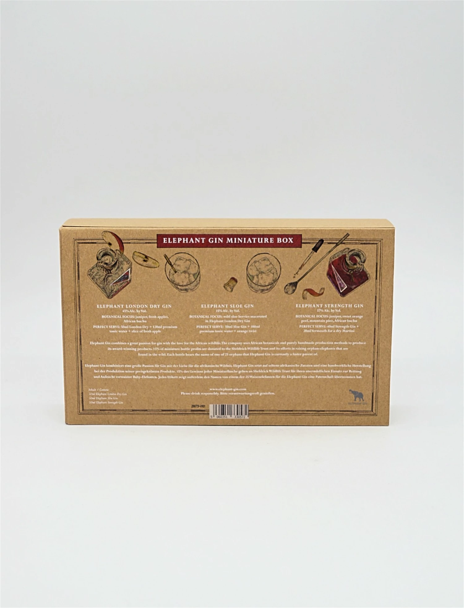 Elephant Gin kombiniert eine große Passion für Gin mit der Liebe für die afrikanische Wildnis. Elephant Gin setzt auf seltene afrikanische Zutaten und eine handwerkliche Herstellung bei der Produktion seiner preisgekrönten Produkte. 15% des Gewinns jeder Miniaturflasche gehen an Sheldrick Wildlife Trust für ihren unermütlichen Einsatz zur Rettung und Aufzucht verwaister Baby-Elefanten. Jedes Etikett zeigt außerdem den Namen von einem der 25 Waisenelefanten für die Elephant Gin eine Patenschaft übernommen hat.