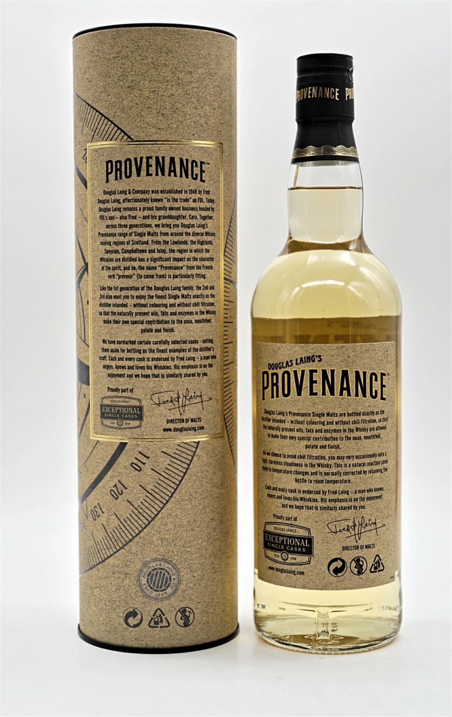 Provenance markiert den Beginn der Reise von Douglas Laing zu außergewöhnlichen Einzelfässern, die vier verschiedene, sich jedoch ergänzende Bereiche umfasst: Provenance, Premier Barrel, Old Particular und XOP (Xtra Old Particular). Für Provenance füllen sie außergewöhnliche Single Cask Single Malts aus einer Vielzahl von Schottlands Whisky Distilleries ab. Jede Abfüllung wird Ihnen „so natürlich wie es nur geht“ angeboten – bei einer Alkoholstärke von 46% oder mehr und ohne Färbung oder Kühlfiltration.