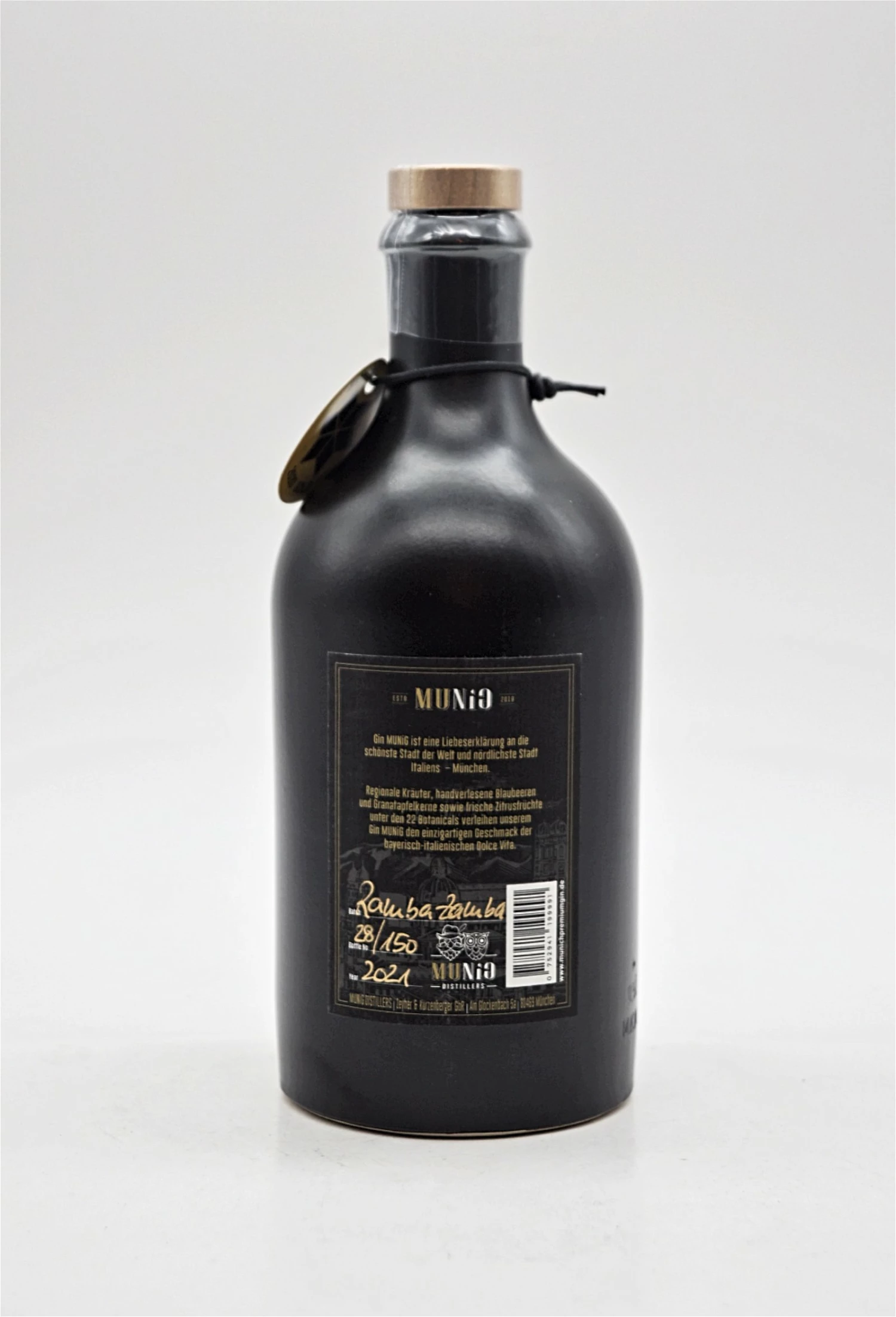 Und es steckt noch mehr MUNiG drin: Gebrannt wird im Münchener Süden, gekauft werden die regionalen Kräuter und frischen Früchte in der Großmarkthalle, gedruckt werden die goldenen Etiketten im westlich von München gelegenen Gröbenzell und nicht zuletzt erhält jedes gebrannte Batch einen eigenen Namen mit Bezug zu München. Durch die Beschriftung von Hand wird schließlich jede Flasche in Schwarz und Gold zu einem Einzelstück.