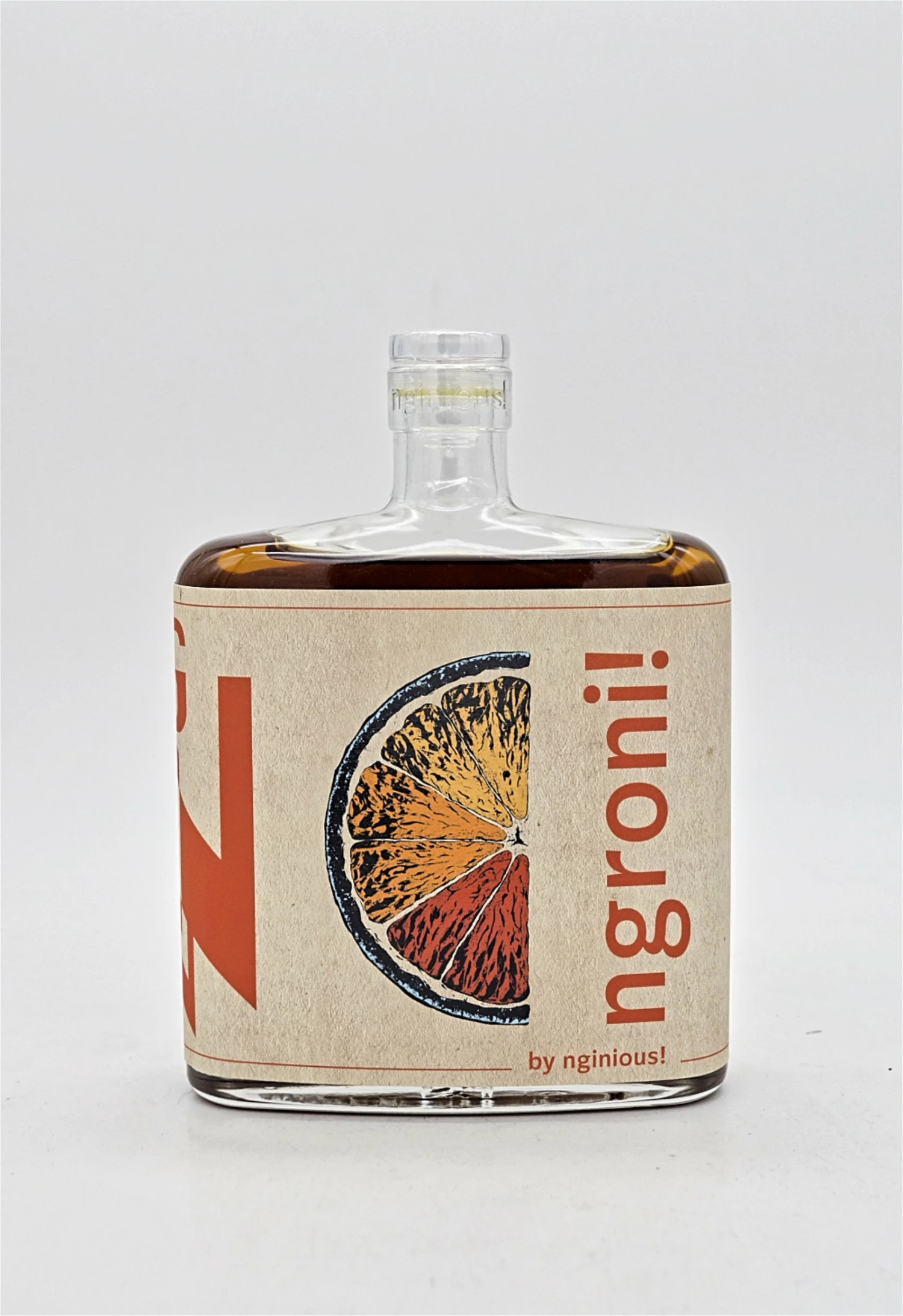 Für die Negroni Interpretation von nginious! wird neben dem nginious! Swiss Blended Gin einer der besten Piemonteser Vermouths verwendet, welcher exklusiv in ehemaligen Barolofässern reift. Beides wird mit einem ausgezeichneten Schweizer Bitter (nach einer originalen Turiner Rezeptur) zum bottled ngroni! by nginious! verschnitten.