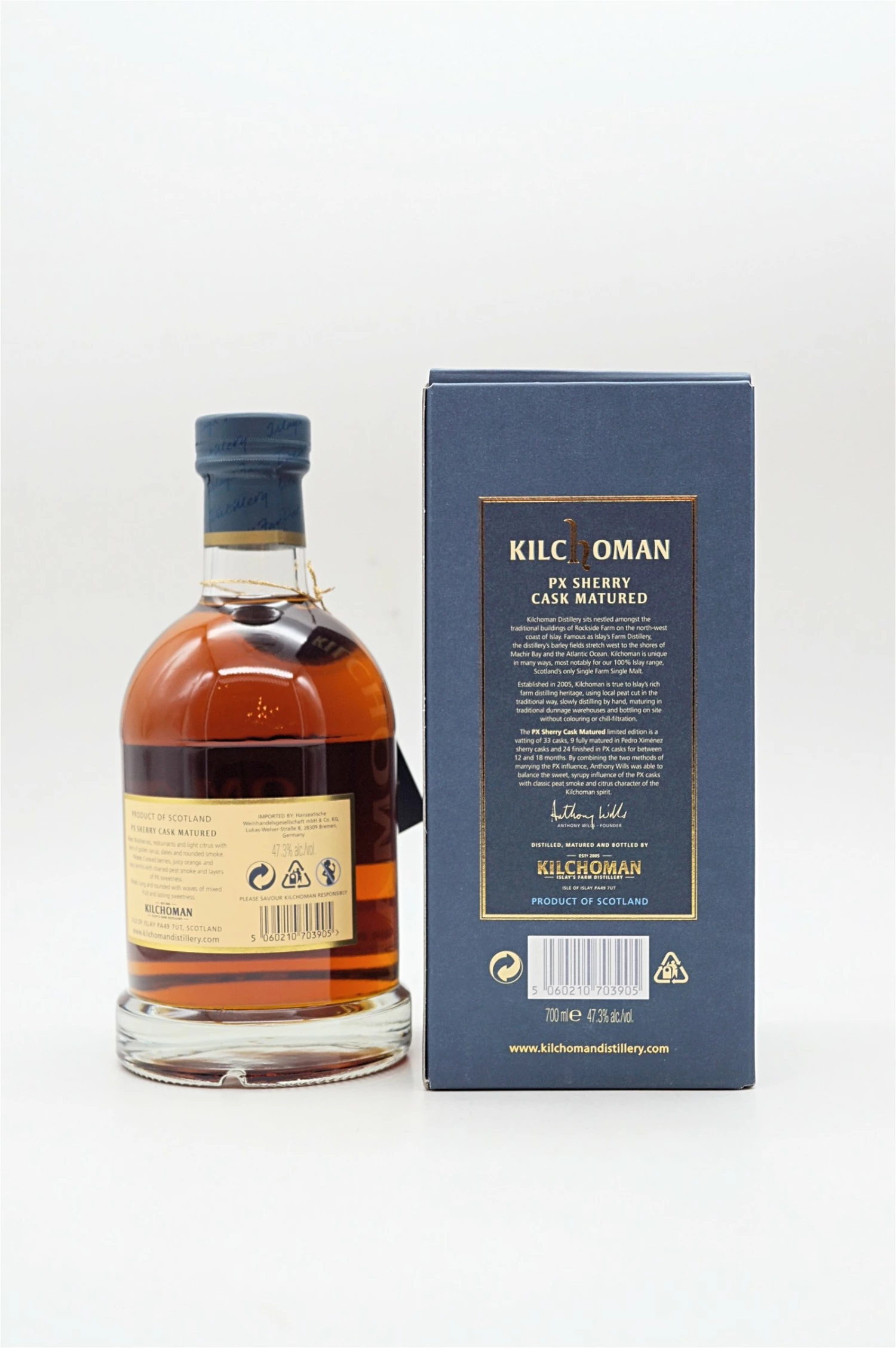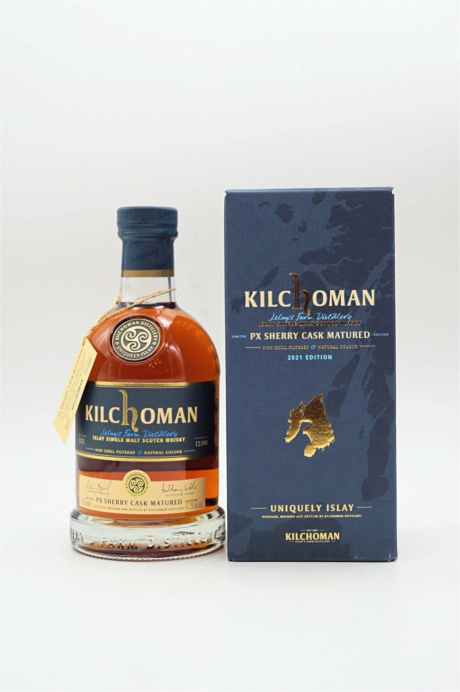 Das Kernsortiment von Kilchoman an Whiskys umfasst Oloroso-Sherry in seiner Reifung, eine mitteltrockene Art von Sherry, die den Whiskys einen Einfluss von gekochten und getrockneten Früchte verleiht. PX unterscheidet sich davon durch eine süßere, reichhaltigere Art von Sherry, die Kilchoman-Whisky-Schichten von Pflaumen verleiht, wobei Karamell wunderbar mit der Zitrussüße, gekochten Früchten und maritimem Torfrauch ihres Geistes harmoniert.