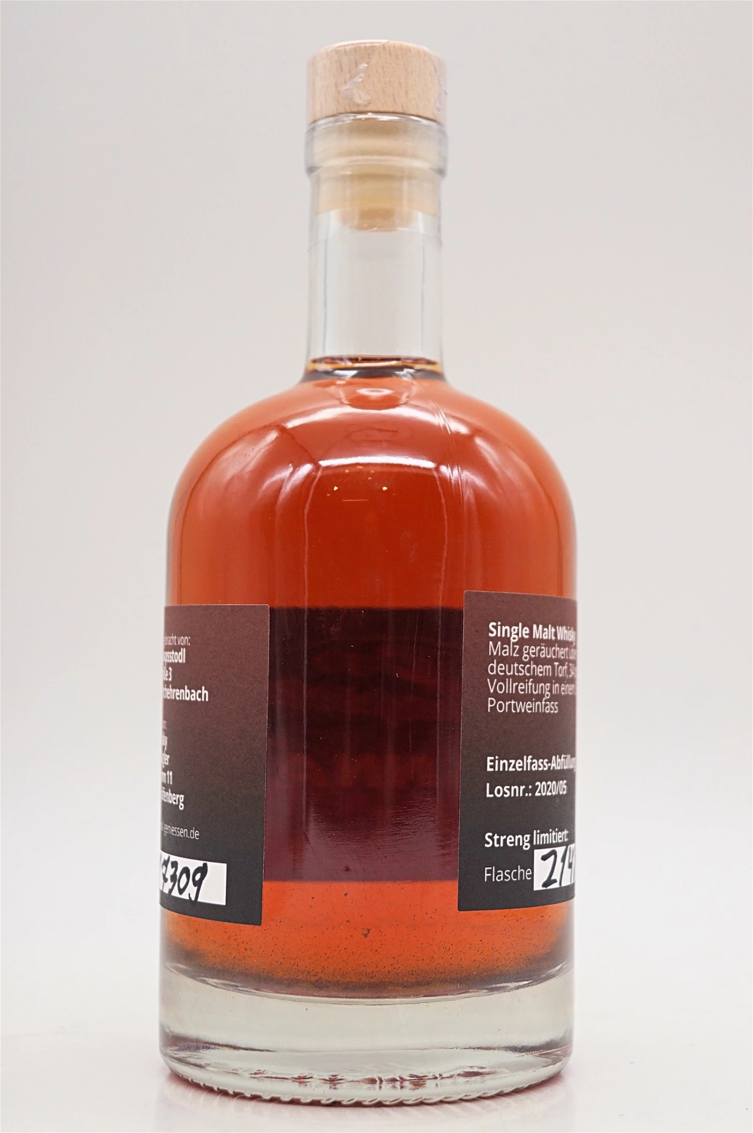 Das Malz für den Single Malt wurde über deutschem Torf (34 ppm) geräuchert. Herausgekommen ist ein rötlich-bernsteinfarben schimmernder Whisky.