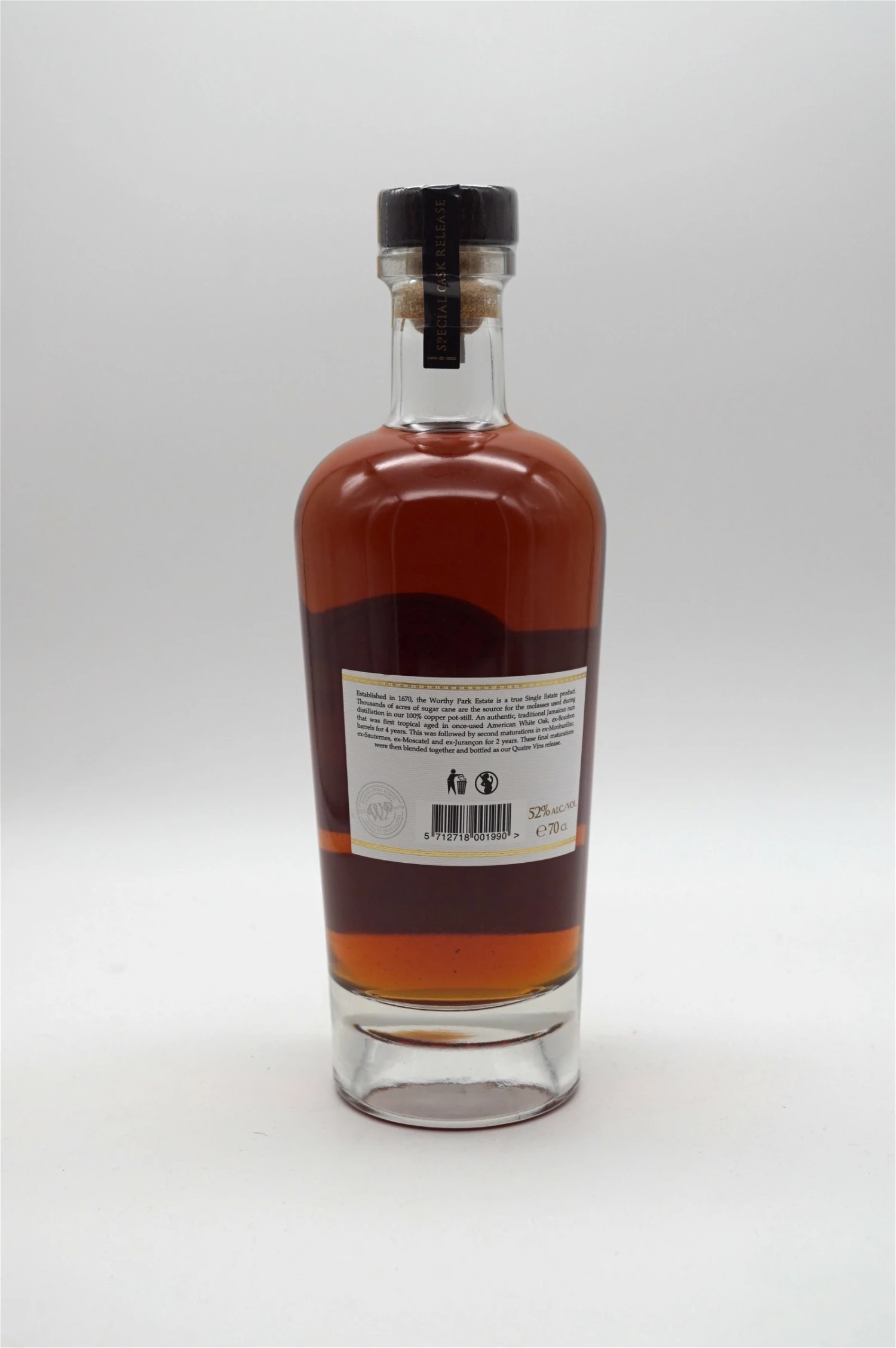 Der exklusive Worthy Park Jamaica Rum Special Cask Quatre Vin 2013 schreibt sich genau genommen eigentlich Quatre Vins. Aus dem Französischen übersetzt bedeutet das „Vier Weine“ und macht Sinn, wenn man die Produktdetails unter die Lupe nimmt. Der 2013 von der Worthy Park Distillery aus Melasse gebrannte Jamaika Rum durfte nämlich erst einmal vier Jahre lang ganz klassisch in Bourbonfässern aus amerikanischer Weißeiche lagern. Dann ging es an die ausgeklügelte, vierfache Veredlung in verschiedenen Fasstypen, mit der sich die spannende Limited Edition von der Masse abhebt: Der Worthy Park Jamaica Rum Special Cask Quatre Vin 2013 verbrachte für seine Nachlagerung zwei Jahre in vier Weinfässern. Die Fassarten Montbazillac, Sauternes, Moscatel und Jurancon übten dabei jeweils sechs Monate lang einen anderen Einfluss auf den Rum aus der Karibik aus, bevor die Brennerei ihre Sonderedition 2019 als Cask Strength Rum mit recht hohem Alkoholgehalt abfüllte. Die unterschiedlichen Weinfässer stellen ein gewagtes, aber gelungenes Experiment dar.