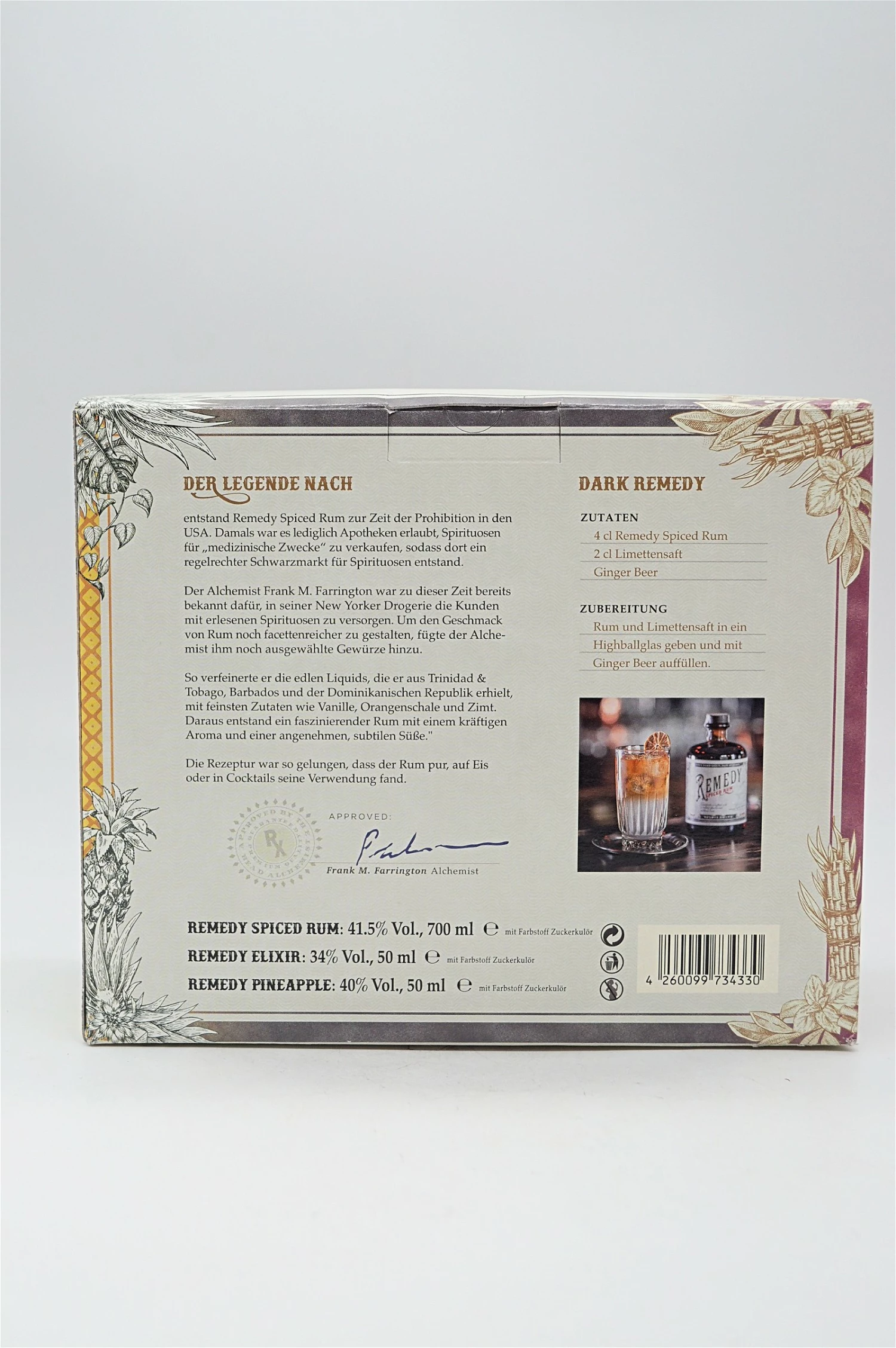 Der Legende nach entstand Remedy Spiced Rum zur Zeit der Prohibition in den USA. Damals war es lediglich Apotheken erlaubt Spirituosen für “medizinische Zwecke” zu verkaufen. Der Apotheker Frank M. Farrington entwickelte daraufhin diesen edlen, mit Gewürzen versetzten Rum. Die Rezeptur war so gelungen, dass der Rum pur, auf Eis oder in verschiedenen Cocktails seine Verwendung fand.