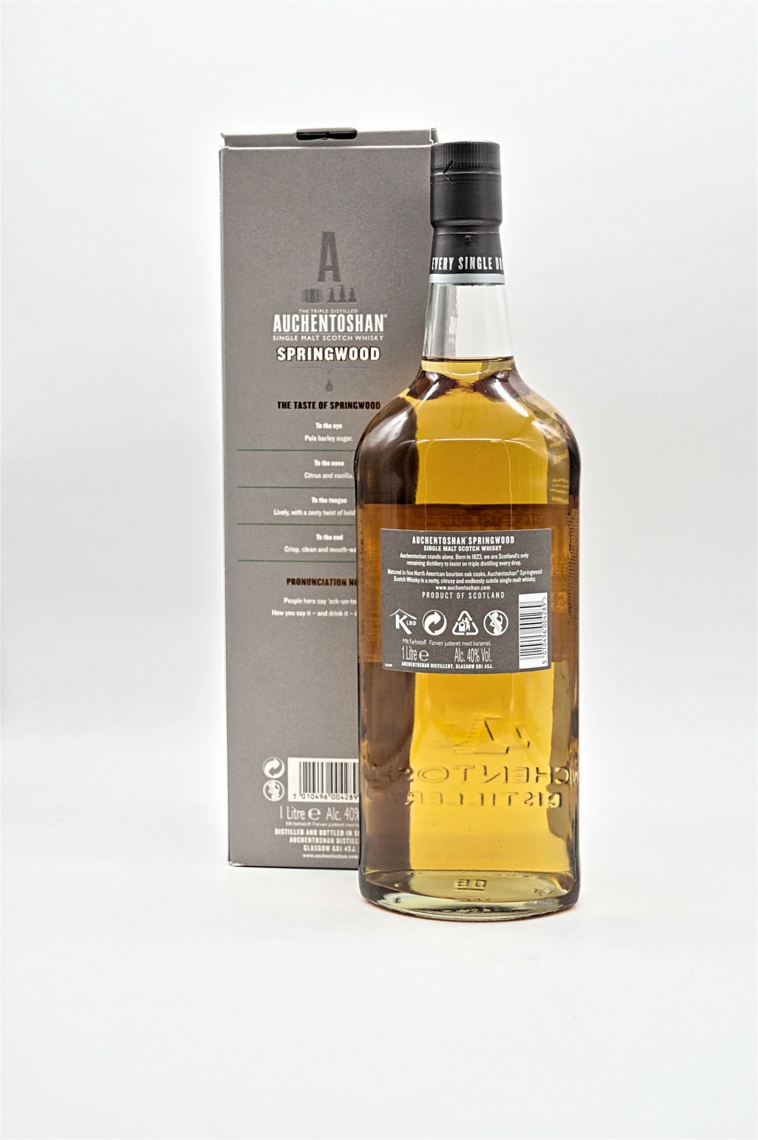 Ihr Markenzeichen, ein sauberer, komplexer Charakter beginnt mit gemälzter optischer Gerste. Sanft gebrannte, völlig ungetorfte Gerste lässt den Auchentoshan-Geschmack aus der Brennerei in Glasgow durchscheinen.