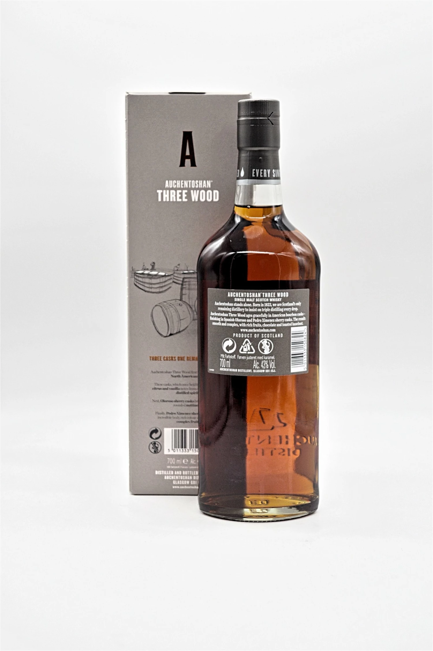 Ihr Markenzeichen, ein sauberer, komplexer Charakter beginnt mit gemälzter optischer Gerste. Sanft gebrannte, völlig ungetorfte Gerste lässt den Auchentoshan-Geschmack aus der Brennerei in Glasgow durchscheinen.