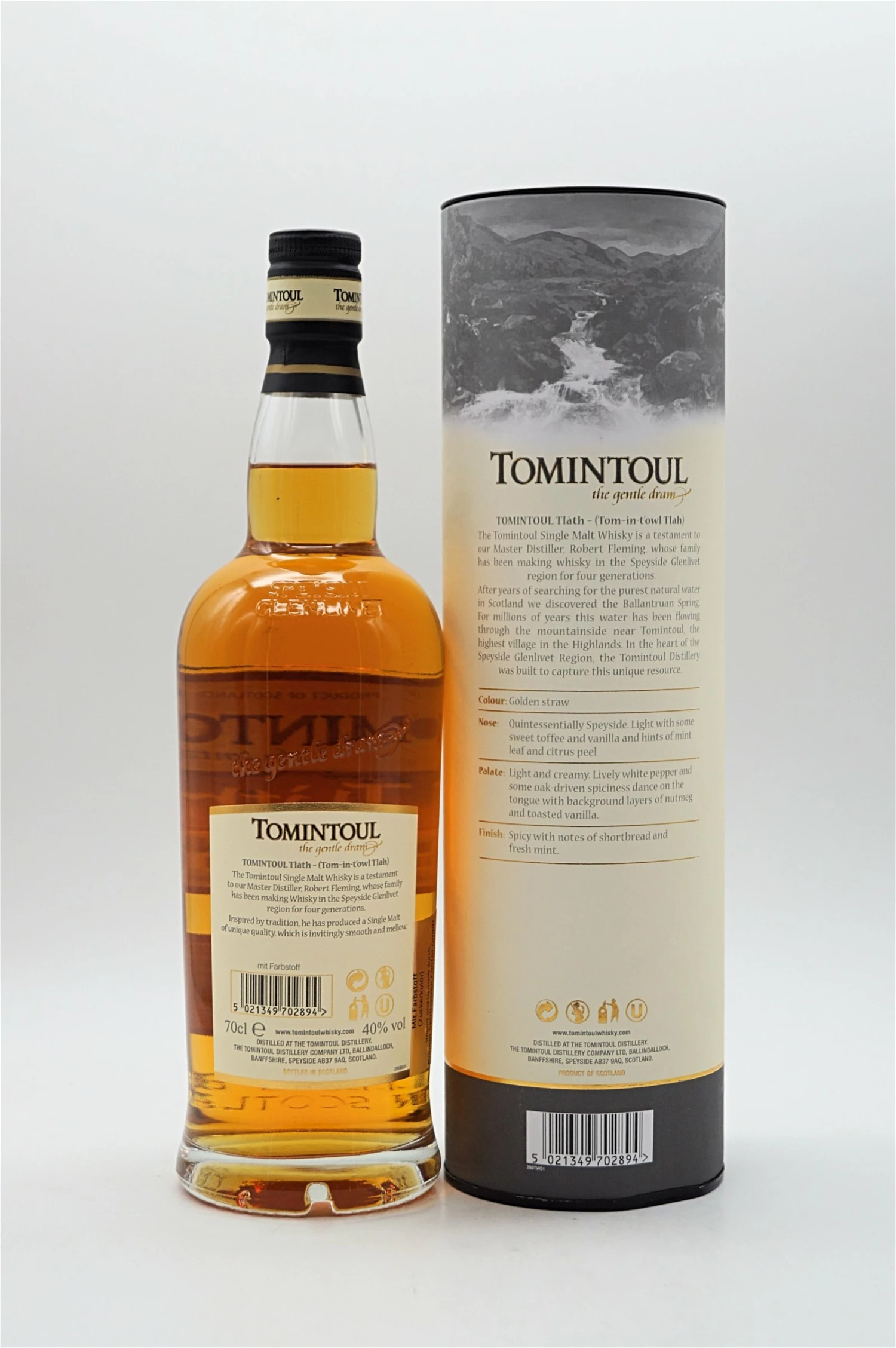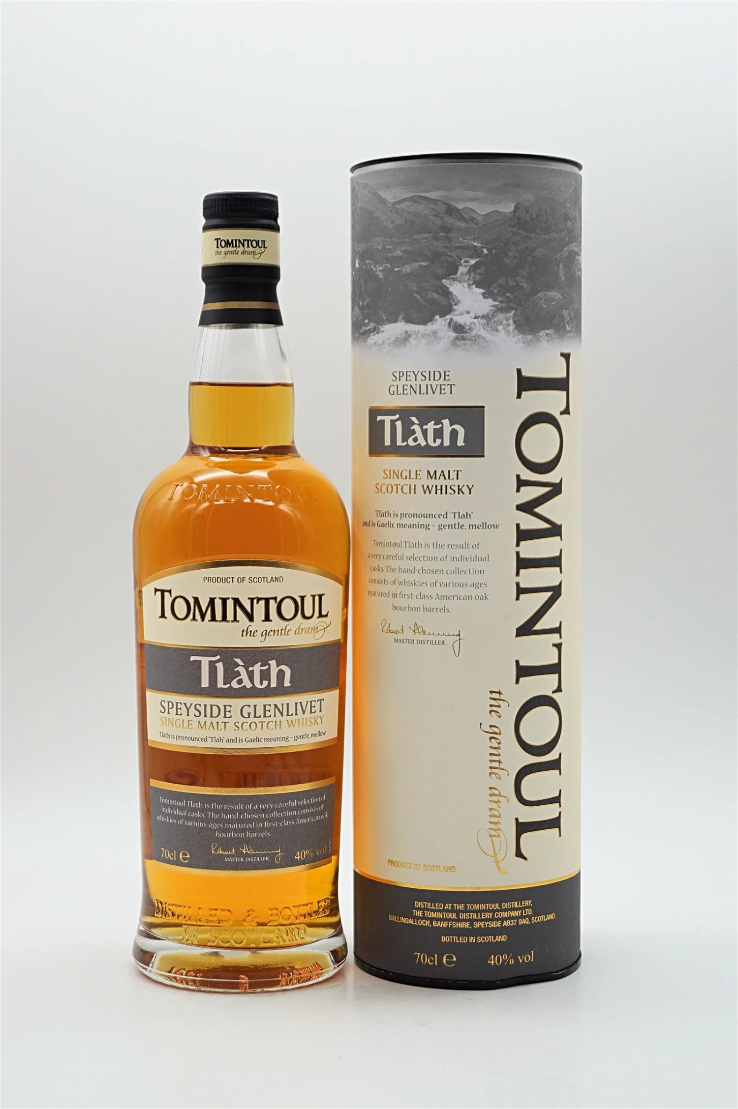 Tlàth wird „Tlah“ ausgesprochen und bedeutet gälisch – sanft, gereift. Diese Beschreibung spiegelt den Begriff „the gentle dram“ wider, der in allen Ausgaben von Tomintoul verwendet wird.