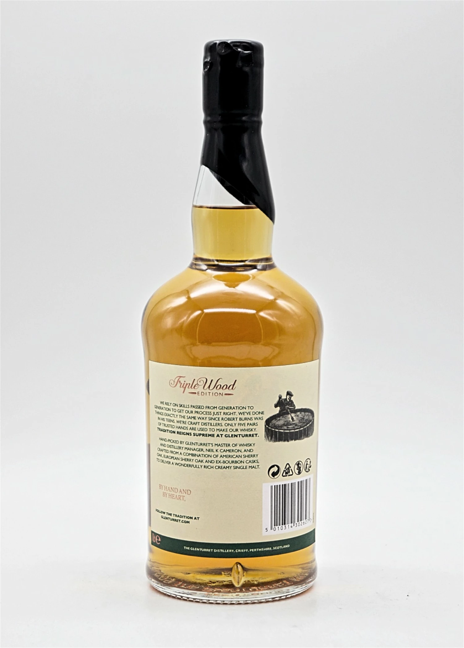 Der Glenturret ist ein leichter heller Whisky, der hier von Hand und mit Herz hergestellt wird. „Triple Wood“ bezieht sich auf die Lagerung des Destillats in gebrauchten Fässern. Dieser Whisky reifte in Ex-Bourbonfässern, American Oak Sherry- sowie European Oak Sherryfässern, welche dem Whisky eine augesprochen intensive Eichennote verleihen.