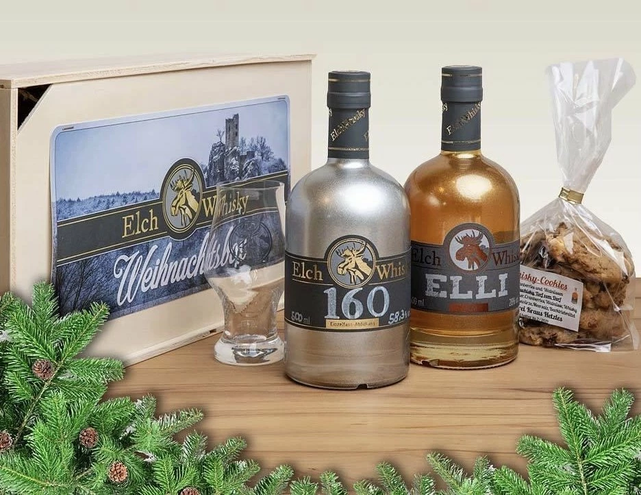 - 0,5 Liter Flasche Whisky-Likör „ELLI“, Sonderedition in gold-lackierter Flasche, 28 % vol. (aktuell nur in unserer Weihnachtsbox erhältlich – im neuen Jahr dann auch regulär)