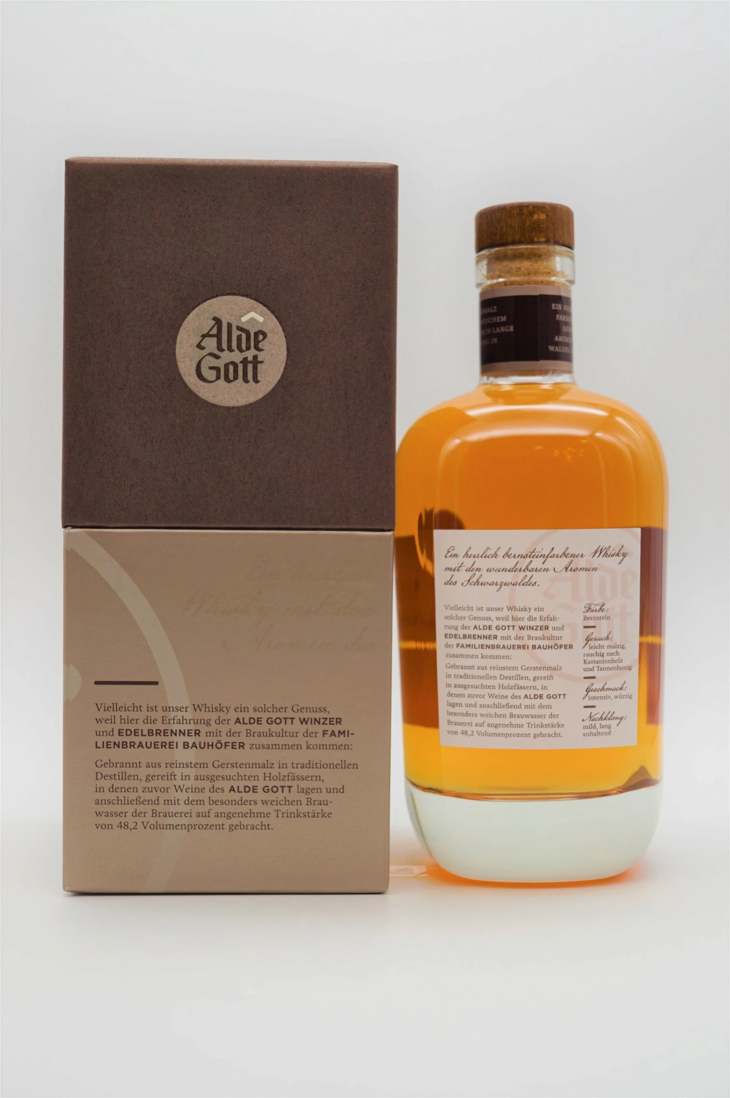 Vielleicht ist der Whisky ein solcher Genuss, weil hier die Erfahrung der ALDE GOTT Winzer und Edelbrenner mit der Braukultur der Familienbrauerei Bauhöfer zusammen kommen: Gebrannt aus reinstem Gerstenmalz in traditionellen Destillen, 4 Jahre gereift in ausgesuchten Holzfässern, in denen zuvor Weine des Alde Gott lagen und anschließend mit dem besonders weichen Brauwasser der Brauerei auf angenehme Trinkstärke von 48,2 Volumenprozent gebracht. Ein herrlich bernsteinfarbener Whisky mit den wunderbaren Aromen des Schwarzwaldes.