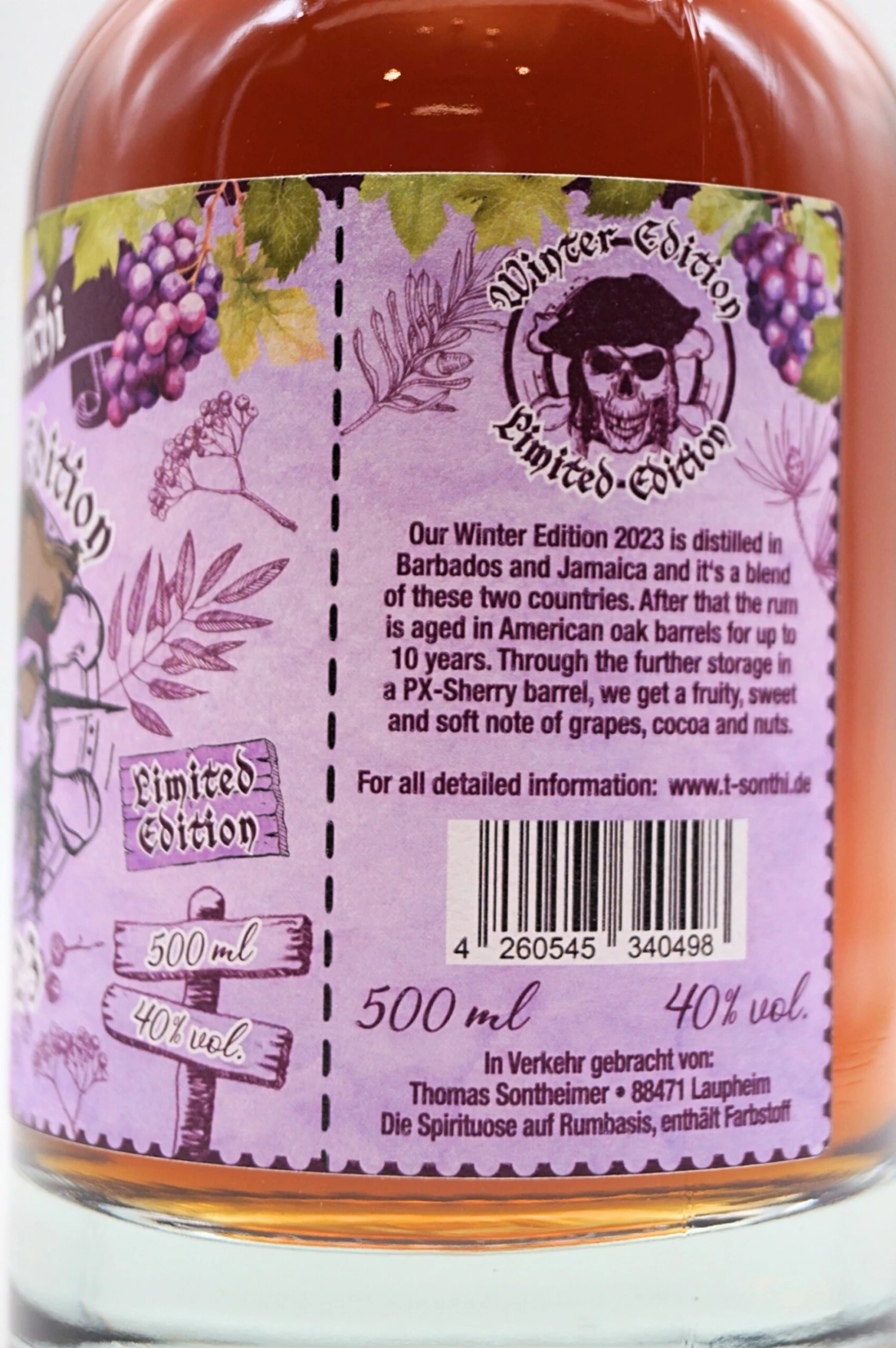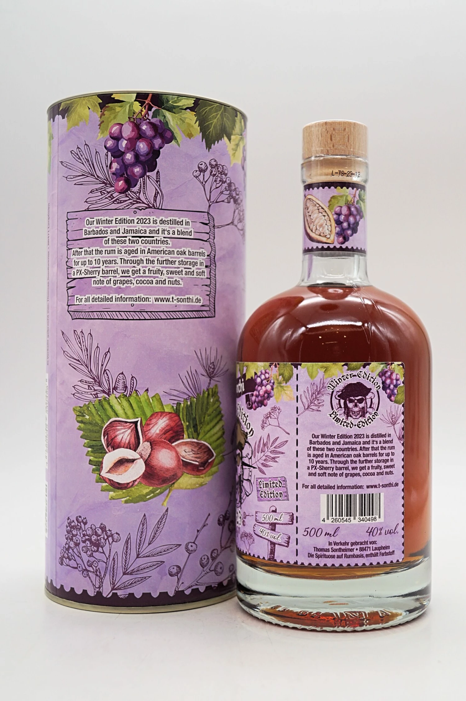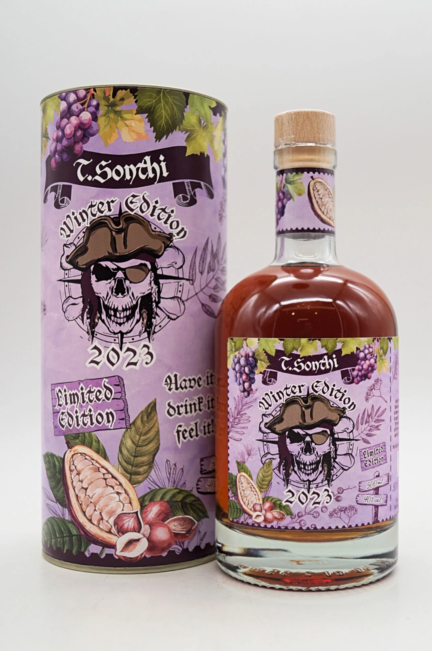 Der T. Sonthi Winter Edition 2023 wird in Barbados und Jamaika destilliert und ist ein Blend-Rum, der aus beiden Ländern stammt. Nach der Destillation reift dieser Rum bis zu 10 Jahre lang in amerikanischen Eichenfässern. Durch das abschließende Finish in einem PX-Sherry-Fass entwickelt er fruchtige und süße Nuancen mit Aromen von Trauben, Kakao und Nüssen.